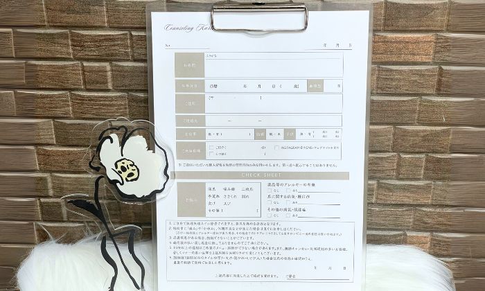 簡単なカルテのご記入をお願いし、お爪の状態やお悩み、ライフスタイルに合わせたご希望をじっくりお伺いします。