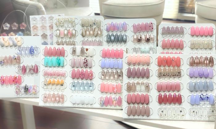 当サロンでは、肌なじみの良い落ち着いたカラーや、季節感のある繊細なアートなど、上品なデザインを豊富にご用意しています。